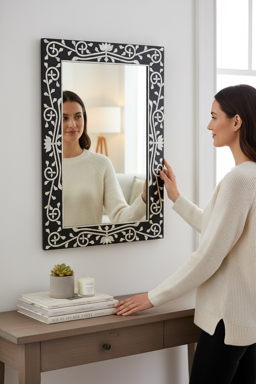 Mother of pearl Mirrors are inlaid to form the ivory frames that define our gorgeous wall mirrors. It gives royal look to your home and can be used in bedroom.