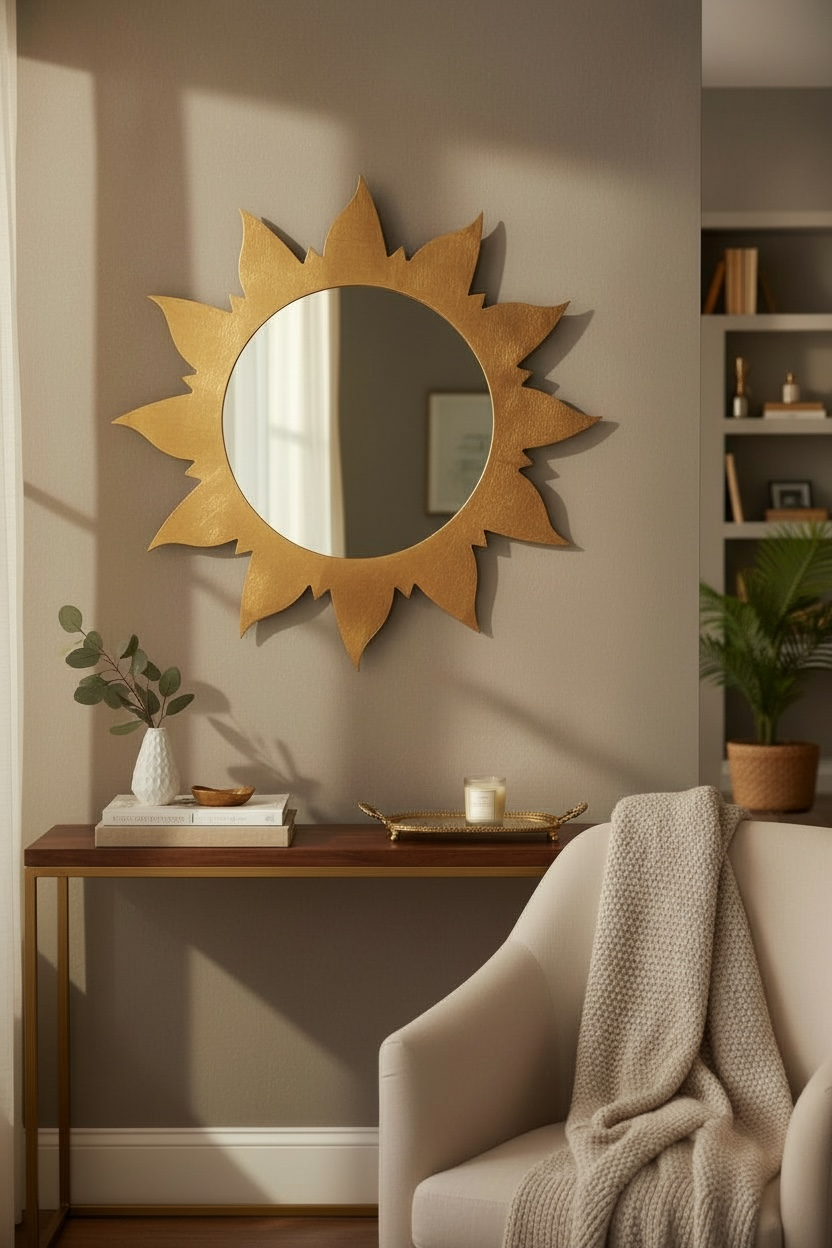 Golden leaf sun mirror, a whole new concept of changing perception of choice in modern architecture, It gives Luxurious feel to your home,this mirror can be used in bedroom, drawing room, entry foyer etc.The mirror has been manufactured by our well skilled team who assures the best quality of every mirror.